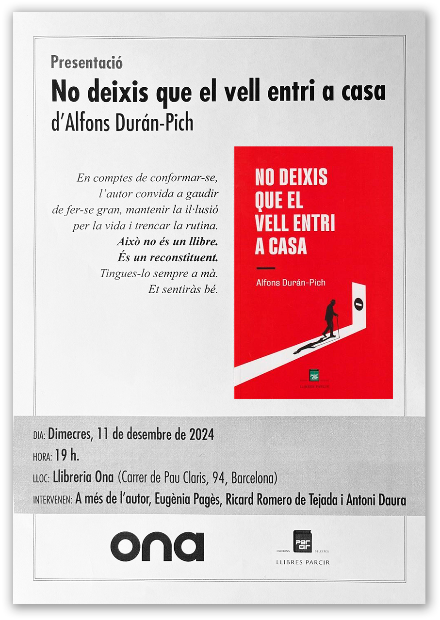 Llevo tiempo trabajando sobre esto. Y este trabajo ha producido un nuevo libro con el título “NO DEJES QUE EL VIEJO ENTRE EN CASA” (castellano) y “NO DEIXIS QUE EL VELL ENTRI A CASA” (catalán). Lo presentaré en la librería ONA (Pau Clarís, 94, el próximo 11 de diciembre a las 7 de la tarde. Habrá debate con mi editor Antoni Daura y mis amigos Eugènia de Pagès y Ricard Romero de Tejada.